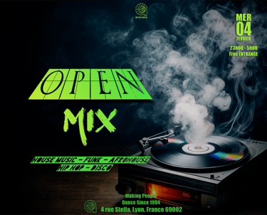 Open Mix est l’occasion pour les oiseaux de la nuit ,les mélomanes , et autres curieux de se déhancher sur une sélection éclectique allant du hip hop , Reggaeton ,la soul , la house , funk , shatta ,disco .. ...etc ..on reste dans la qualité , l'idee est de bien commencer la semaine et de passer une bonne soirée !!!!!!!!!